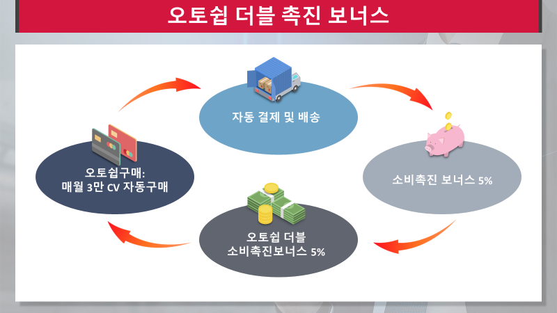 만약 매월3만CV를 자동으로 주문하는 오토쉽구매가 시행되면 더블소비촉진보너스를 지급하게 됩니다.