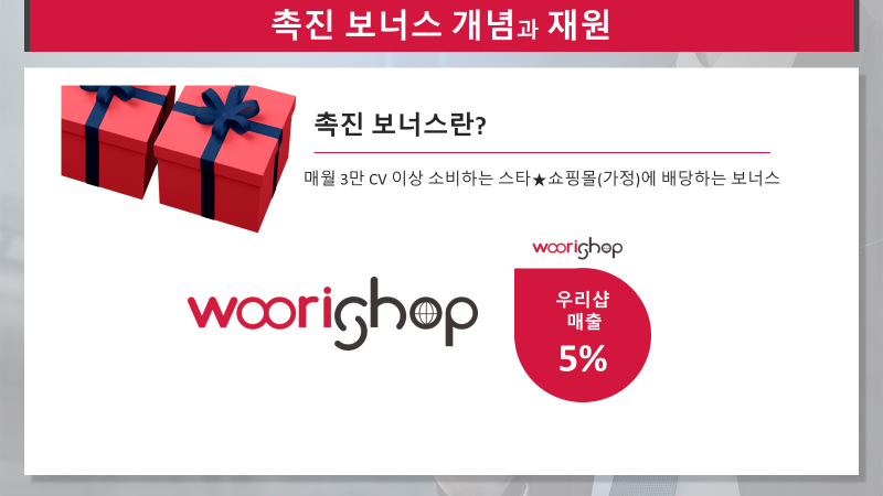 우리샵 보상플랜에 소개된 소비촉진보너스 내용입니다.