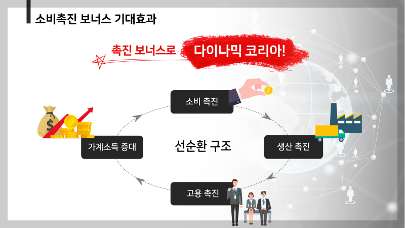 소비촉진보너스는 말 그대로 소비를 촉진하고, 이는 생산촉진으로 이어지며 생산촉진은 고용촉진으로 그리고 가계소득증가로 이어져 선순환 구조를 만들것입니다.