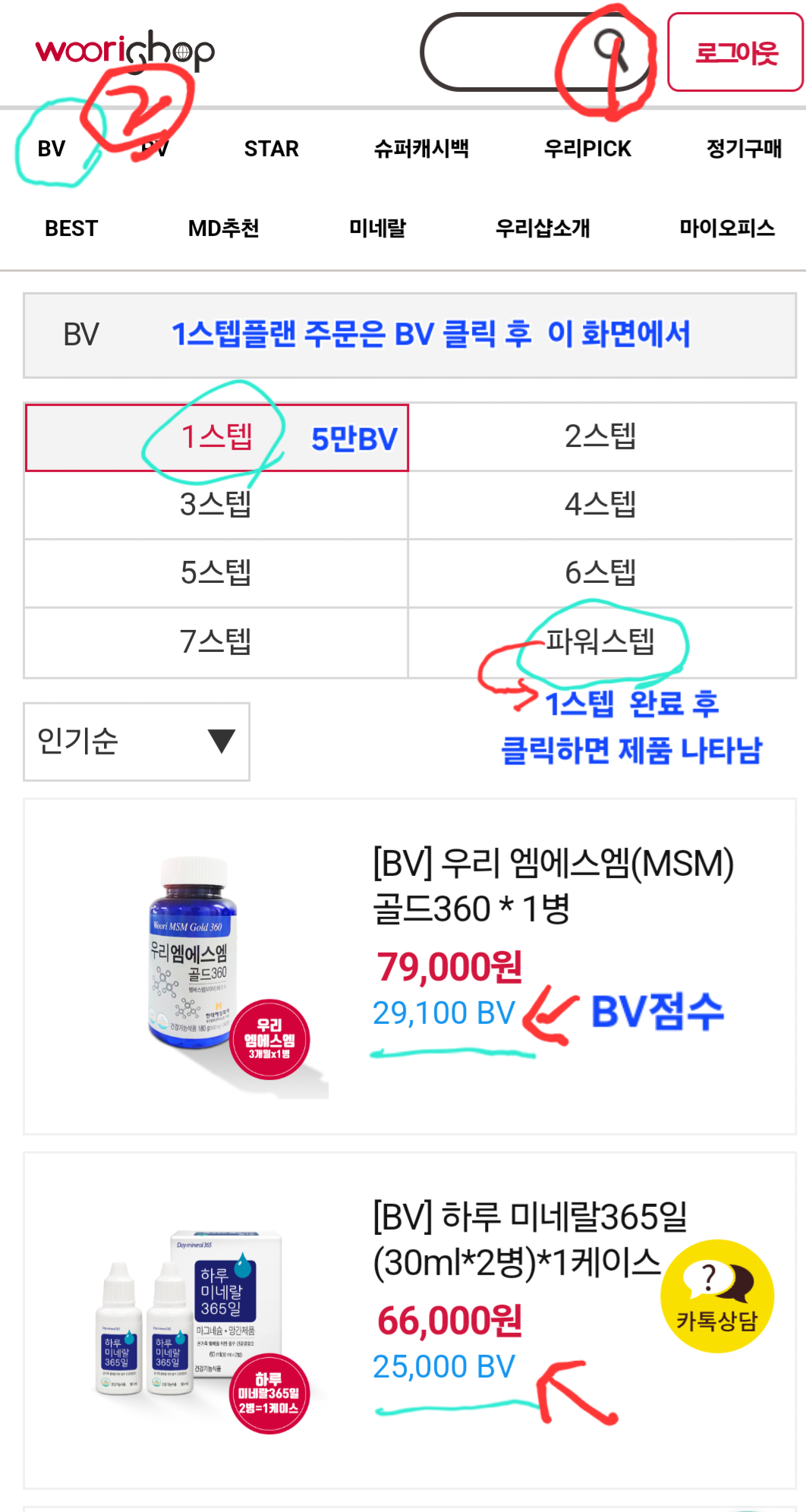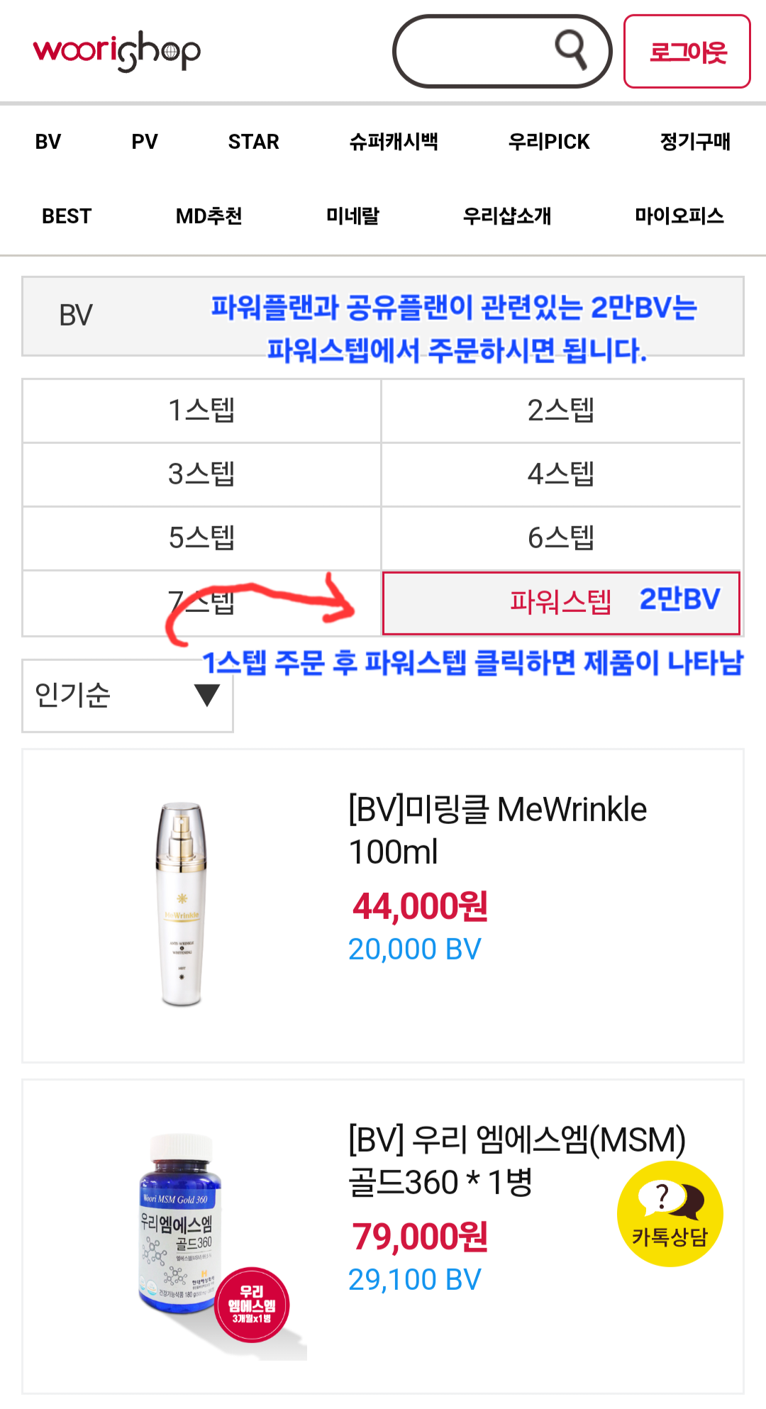 로그인 ㅡ BV ㅡ 1스텝 (5만BV) 주문을 하시면 되시는데 이때 1스텝외에는 아무창도 열리지 않습니다. (1스텝이상 자격이 되어야 열립니다)