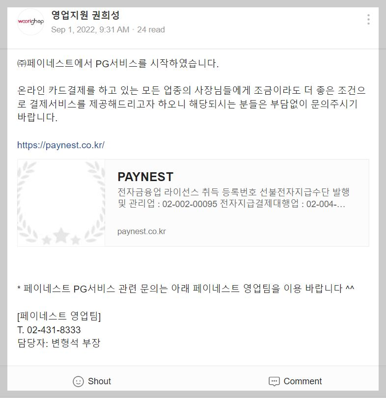 우리샵 영업지원팀에서 (주)페이네스트 PG 서비스가 시작되었다고 공지했습니다.
