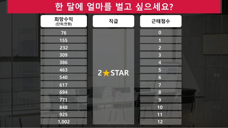이 표는 2스타가 근태점수에 따라 받게될 것으로 예상되는 수익입니다.