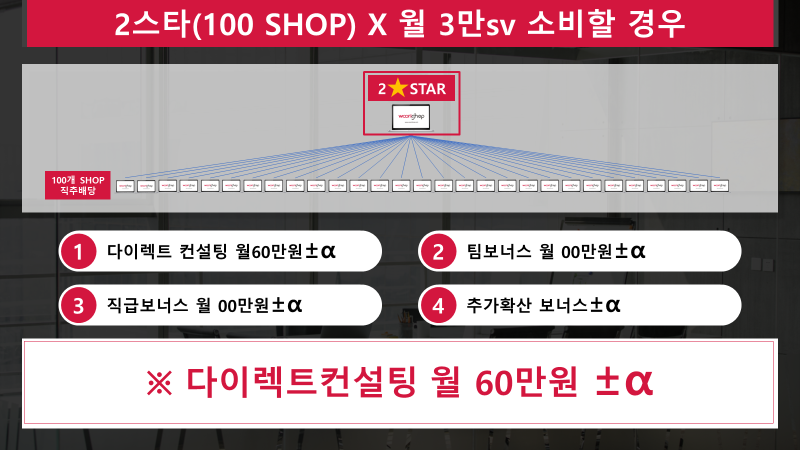 100명의 회원이 3만SV소비를 한다고 가정할때 월60만원의 다이렉트컨설팅수당이 발생합니다.